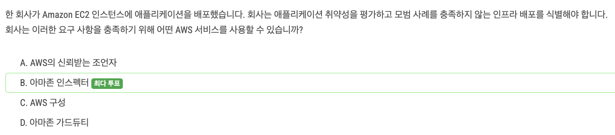 Amazon Inspector: AWS์ ๋ฐฐํฌ๋ ์ ํ๋ฆฌ์ผ์ด์ ์ ๋ณด์ ์ทจ์ฝ์ฑ์ ํ๊ฐํฉ๋๋ค. API ํธ์ถ ๊ฐ์ฌ๋ณด๋ค๋ ๋ณด์ ํ๊ฐ ๋ฐ ์ทจ์ฝ์ ๊ฐ์ง์ ๋ ์ค์ ์ ๋ก๋๋ค.
